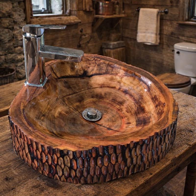 Lavatório de tronco natural original, adicionado em uma imagem de banheiro gerada por IA.