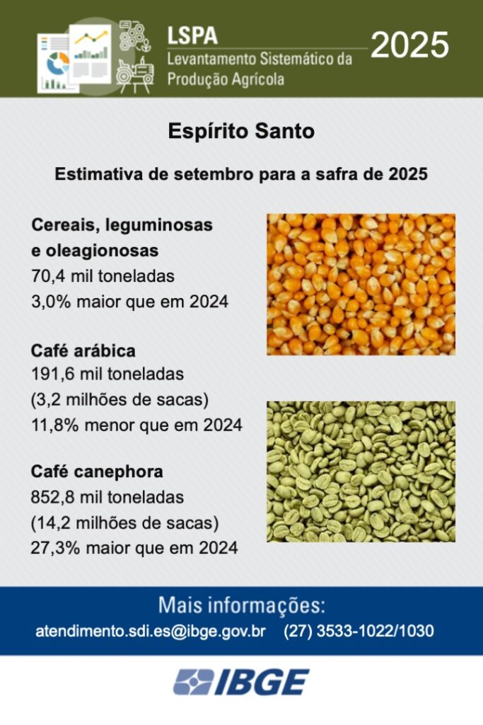 Para o café canephora, a estimativa da produção foi de 1,2 milhão de toneladas ou 20,6 milhões de sacas de 60 kg, acréscimo de 4,2% em relação ao mês anterior, e crescimento de 20,7% em relação ao volume produzido em 2024, com aumentos de 3,1% na área a ser colhida e de 17,1% no rendimento médio nesse último comparativo. A produção estimada para o café canephora, em 2025, é recorde da série histórica do IBGE.