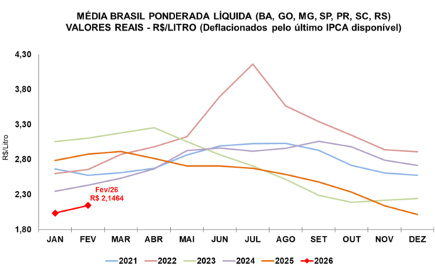 Gráfico 1. Série de preços médios recebidos pelo produtor (líquido), em valores reais (deflacionados pelo IPCA de fevereiro/2026)