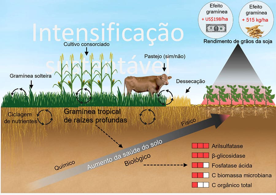 Ilustração esquemática que sintetiza os principais efeitos positivos do cultivo de gramíneas tropicais de raízes profundas sobre os indicadores biológicos da saúde do solo e a produtividade da soja em condições de campo no Brasil