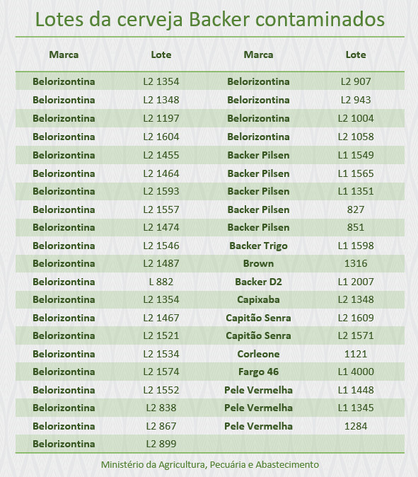 Mais dez lotes de cerveja da marca Backer foram identificados pelo Ministério da Agricultura, Pecuária e Abastecimento (Mapa) com a presença dos contaminantes etilenoglicol ou dietilenoglicol. Até o momento, as análises realizadas pelos Laboratórios Federais de Defesa Agropecuária constataram 41 lotes contaminados de dez rótulos da cervejaria: Belorizontina, Backer Pilsen, Backer Trigo, Brown, Backer D2, Capixaba, Capitão Senra, Corleone, Fargo 46 e Pele Vermelha.
