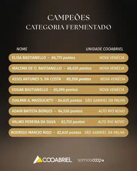 Entre os fermentados, o café campeão alcançou a pontuação de 86,775, tem origem em Nova Venécia e pertence à cooperada Elisa Bastianello. Vinda de uma família com forte tradição na cafeicultura, a jovem de 23 anos garantiu o primeiro lugar na categoria.