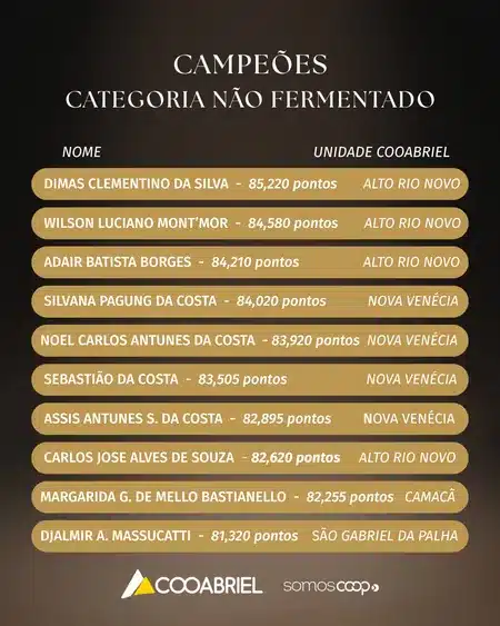Entre os não fermentados, o destaque foi o pódio triplo formado por cooperados de Alto Rio Novo. Estreante no concurso, o grande campeão foi Dimas Clementino da Silva, cujo café alcançou a pontuação de 85,220.