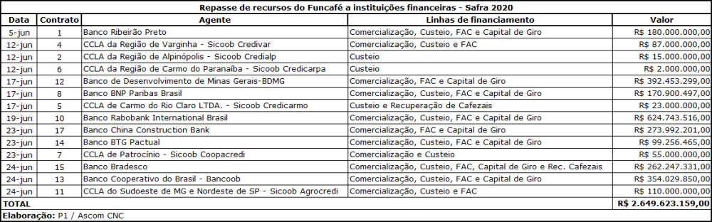 Com o atual envio do capital aos bancos China Construction, BTG Pactual, Bradesco e Bancoob e aos Sicoobs Coopacredi, de Patrocínio (MG), e Agrocredi, das regiões sudoeste de Minas e nordeste de São Paulo, os repasses do Funcafé na safra 2020 aos agentes totalizam R$ 2,650 bilhões.