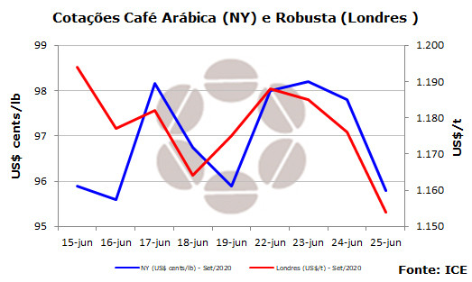 Na Bolsa de NY, o vencimento set/20 fechou a quinta-feira a US$ 0,958 por libra-peso, caindo 10 pontos no balanço semanal. Na ICE Europe, o vencimento set/20 recuou US$ 21, cotado a US$ 1.154 por tonelada.