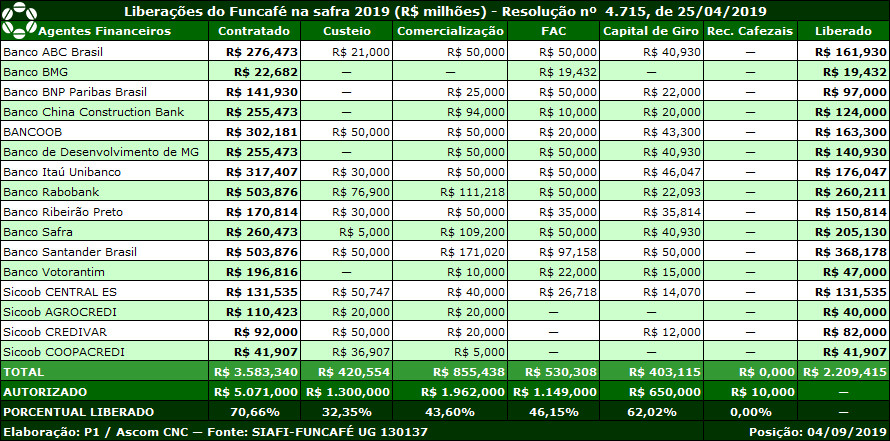 O Conselho Nacional do Café (CNC) informa que, nesta semana, foram iniciados os repasses dos recursos do Funcafé às instituições financeiras. Até hoje, dos 33 agentes que assinaram os contratos com o Mapa, 16 receberam R$ 2,209 bilhões para as linhas de Custeio, Comercialização, Financiamento para Aquisição de Café (FAC) e Capital de Giro.