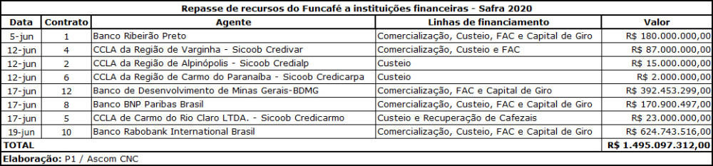 Segundo compilação realizada pelo Conselho Nacional do Café (CNC), até hoje (19), o governo federal repassou R$ 1,495 bilhão do Fundo de Defesa da Economia Cafeeira (Funcafé) para oito agentes financeiros disponibilizarem recursos ao setor na safra 2020.