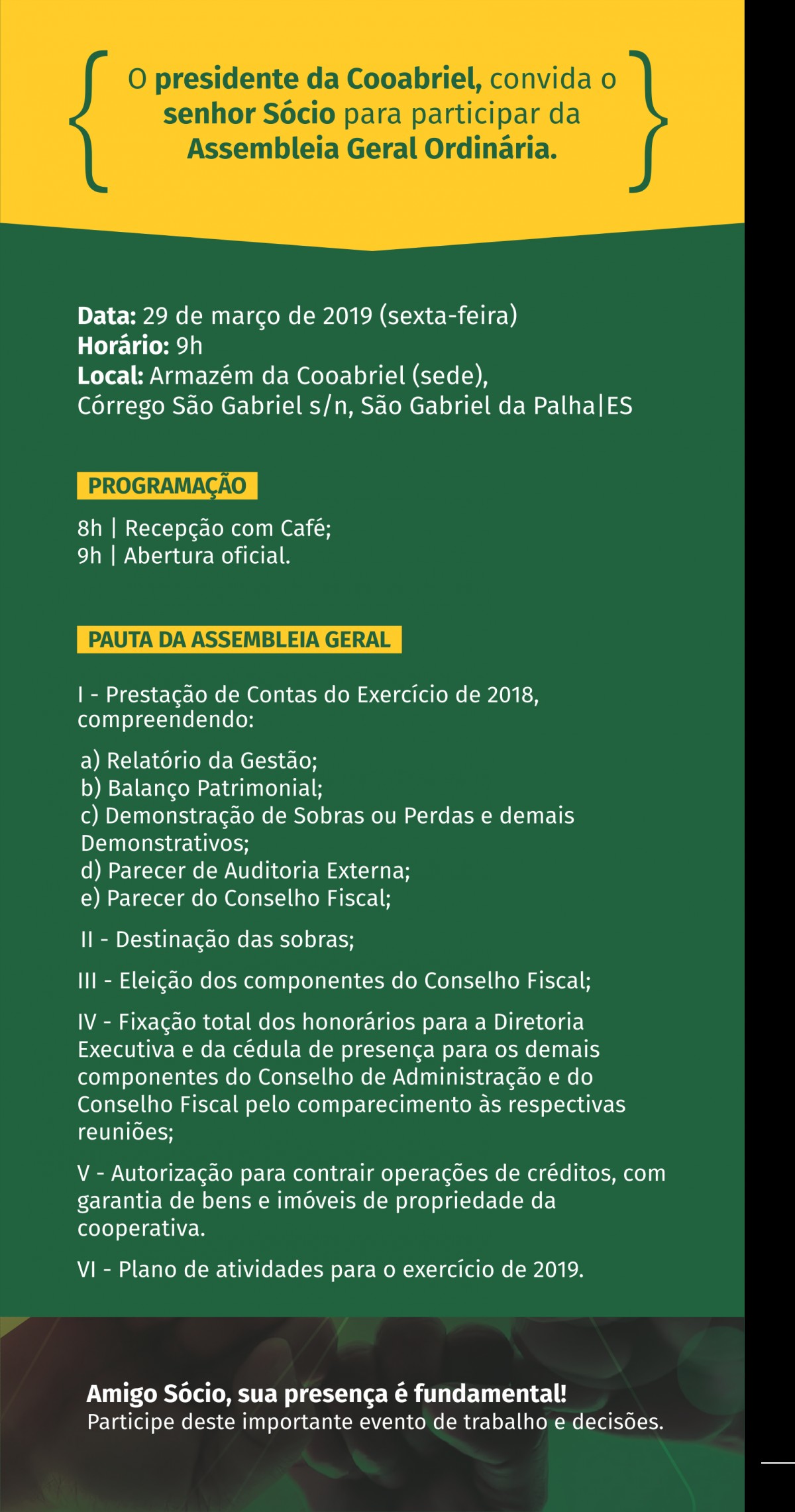 A Cooabriel reunirá seus associados em Assembleia Geral no próximo dia 29, para a prestação de contas do ano de 2018. O evento será realizado nas dependências do armazém sede, no Córrego São Gabriel em São Gabriel da Palha.