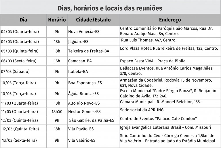 Já está aberto o calendário de reuniões preparatórias para a Assembleia Geral de 2020 da Cooabriel. Os encontros serão realizados no Espírito Santo e na Bahia.