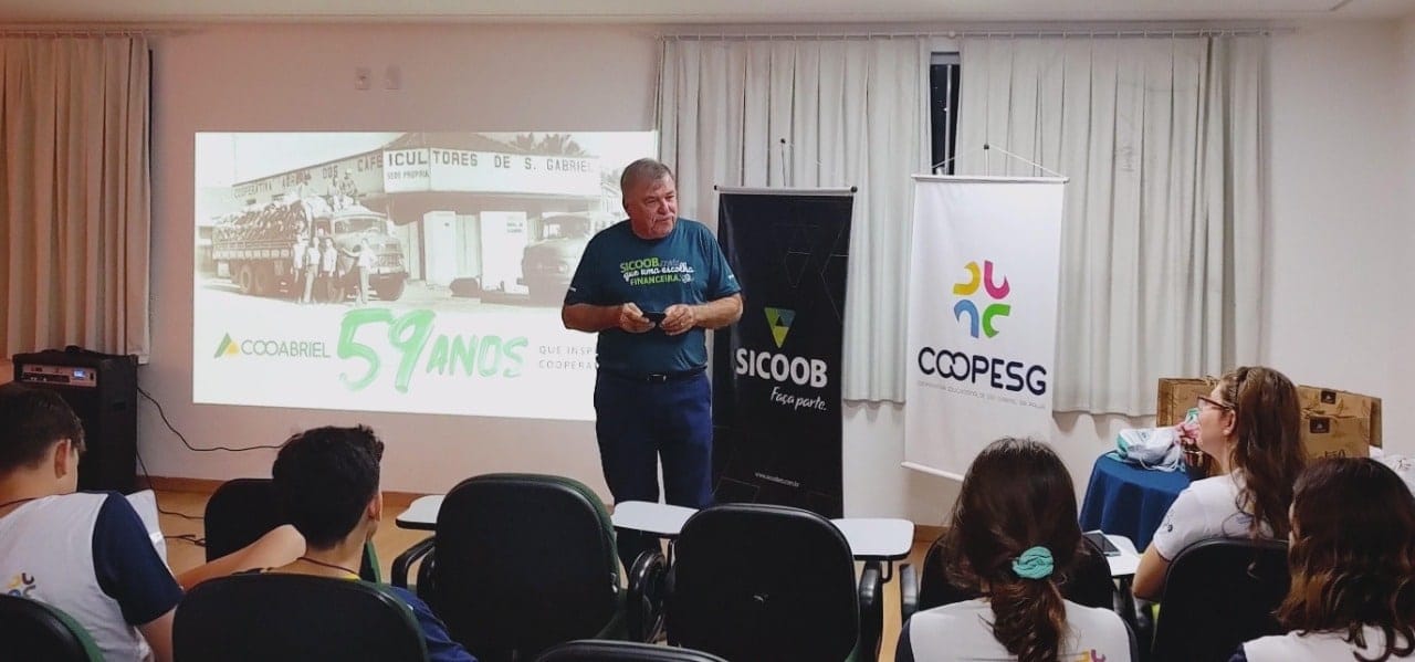 Na última terça-feira (13), aconteceu mais uma etapa dos fóruns regionais do Projeto Cooperativa Mirim do Sicoob. Desta vez, o evento aconteceu na escola Coopesg, em São Gabriel da Palha. Estiveram presentes membros de outras cooperativas como Cooabriel, Coopcam e, claro, do Sicoob. O principal palestrante foi o presidente do Sicoob ES, Bento Venturim, que falou sobre a importância do cooperativismo na formação das pessoas e de uma sociedade mais justa e unida.