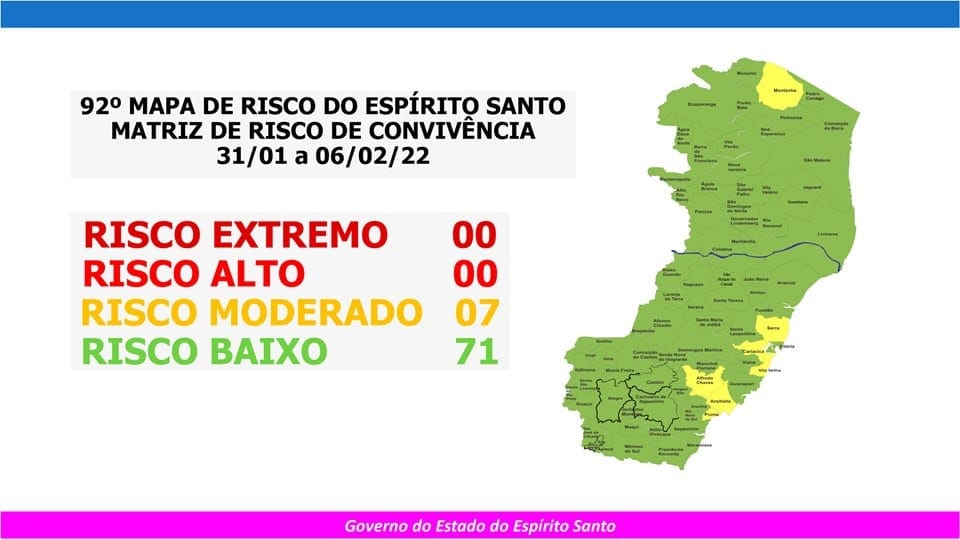 O Governo do Estado anunciou o 92º Mapa de Risco Covid-19, que terá vigência desta segunda-feira (31) até o próximo domingo (06). Dos 78 municípios capixabas, 71 estão classificados em Risco Baixo e sete municípios ficarão em Risco Moderado. Não há municípios classificados em Risco Alto.