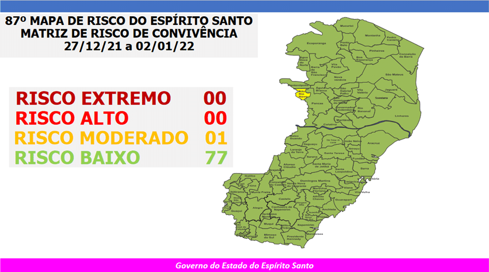 O 87º Mapa de Risco Covid-19, que terá vigência a partir desta desta segunda-feira (27) até o próximo domingo (2), tem um município em risco moderado. Os demais 77 municípios, permanecem no risco baixo para a doença. Não há municípios em risco alto. Até o momento, nenhuma microrregião conseguiu atingir os três índices para a classificação de risco muito baixo.