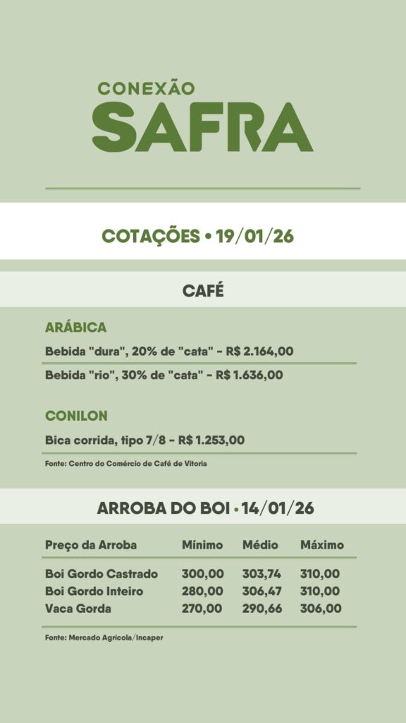 Cotações atualizadas de café, boi gordo e hortifrúti neste 19 de janeiro mostram o comportamento dos preços no mercado agropecuário capixaba
