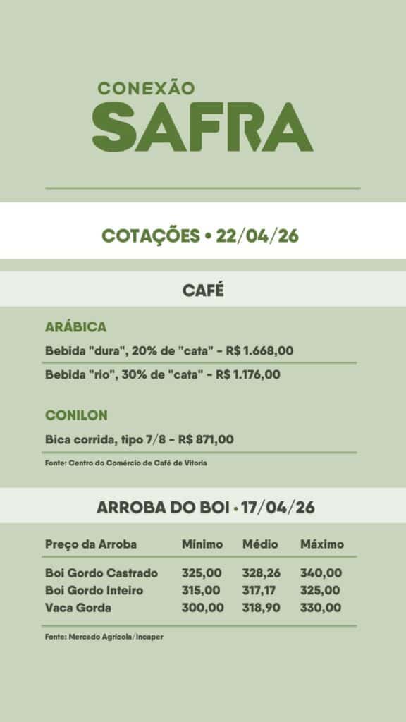 Confira as cotações do café, boi e hortifrúti de hoje(22/04), com variações significativas que podem impactar produtores e consumidores.