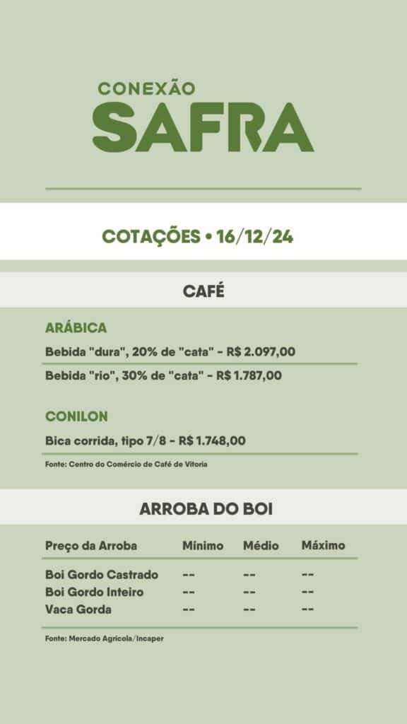 Confira as cotações do café, boi e hortifruti de hoje (16/12), com variações significativas que podem impactar produtores e consumidores.
