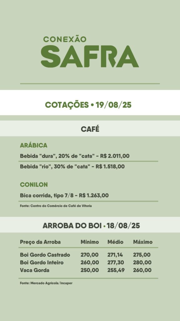 Confira as cotações do café, boi e hortifruti de hoje(19/08), com variações significativas que podem impactar produtores e consumidores.