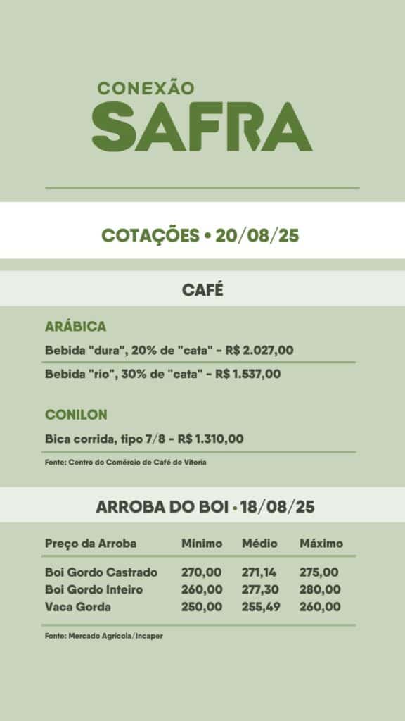 Confira as cotações do café, boi e hortifruti de hoje(20/08), com variações significativas que podem impactar produtores e consumidores.
