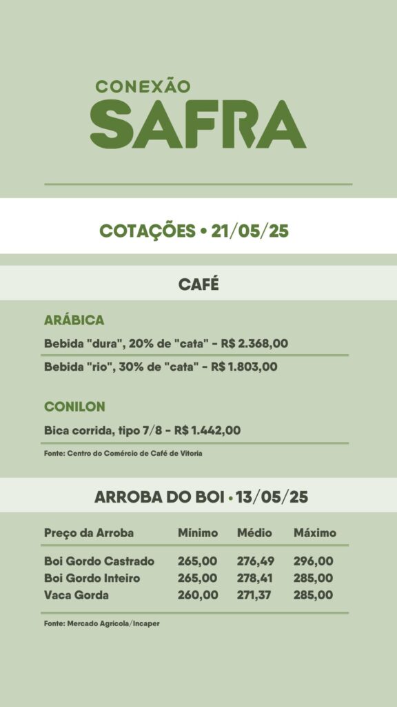 Confira as cotações do café, boi e hortifruti de hoje(21/05), com variações significativas que podem impactar produtores e consumidores.