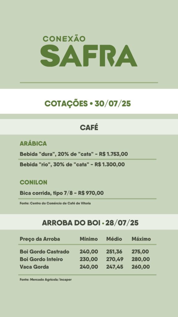 Confira as cotações do café, boi e hortifruti de hoje(30/07), com variações significativas que podem impactar produtores e consumidores.