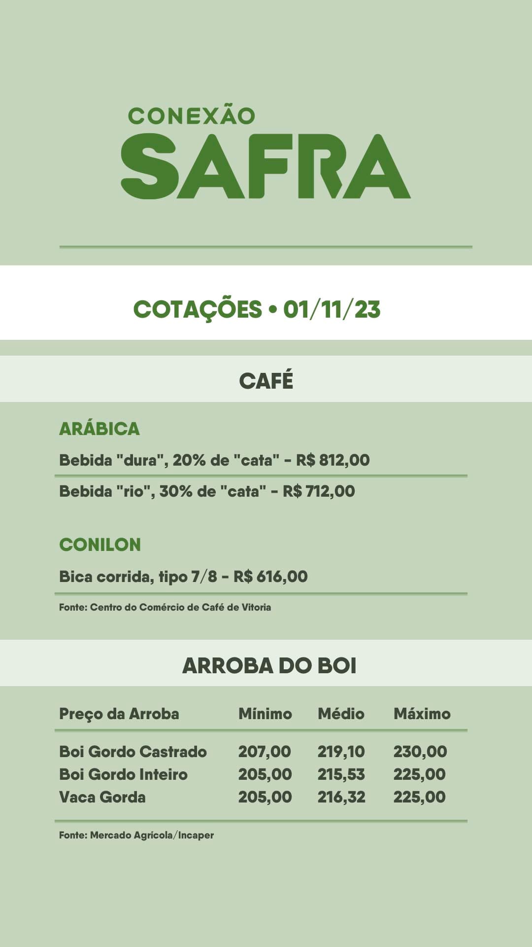 Confira as cotações do café, boi e hortifruti de hoje (01/11)