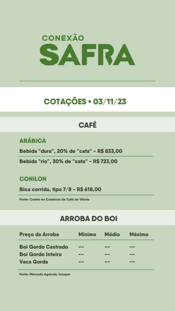 Confira as cotações do café, boi e hortifruti de hoje (03/11), com variações significativas que podem impactar produtores e consumidores.