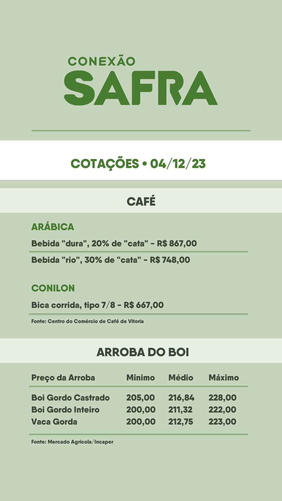 Confira as cotações do café, boi e hortifruti de hoje (04/12), com variações significativas que podem impactar produtores e consumidores.