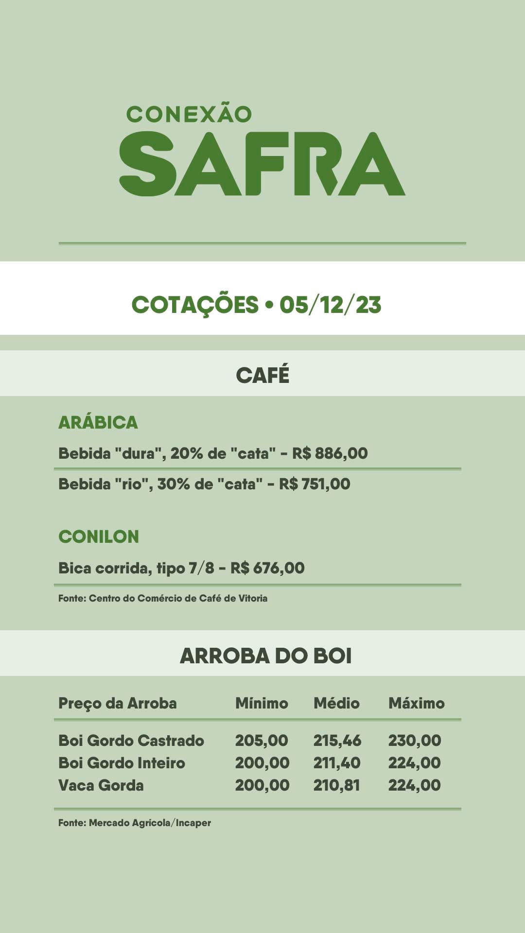 Confira as cotações do café, boi e hortifruti de hoje (05/12), com variações significativas que podem impactar produtores e consumidores.