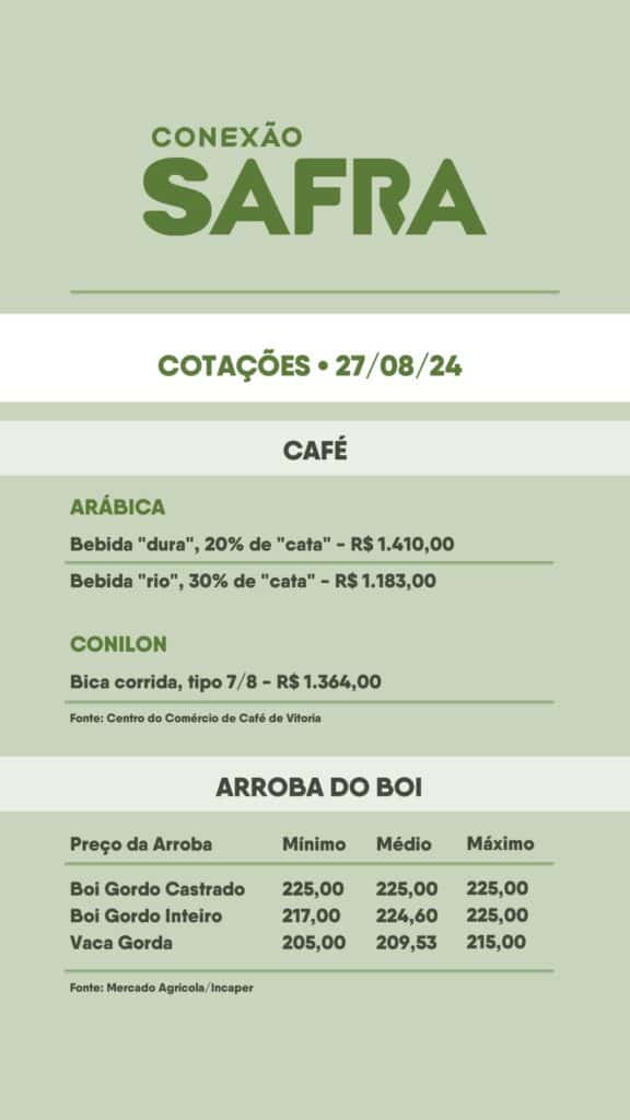 Confira as cotações do café, boi e hortifruti de hoje (27/08), com variações significativas que podem impactar produtores e consumidores.