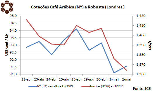 Na quinta-feira, o contrato “C” com vencimento em julho de 2019, encerrou o pregão a US$ 0,9155 por libra-peso na bolsa nova-iorquina, acumulando perdas de 110 pontos. Na ICE Europe, o vencimento julho de 2019 do café robusta recuou US$ 46 na semana, fechando a sessão de ontem a US$ 1.364 por tonelada.