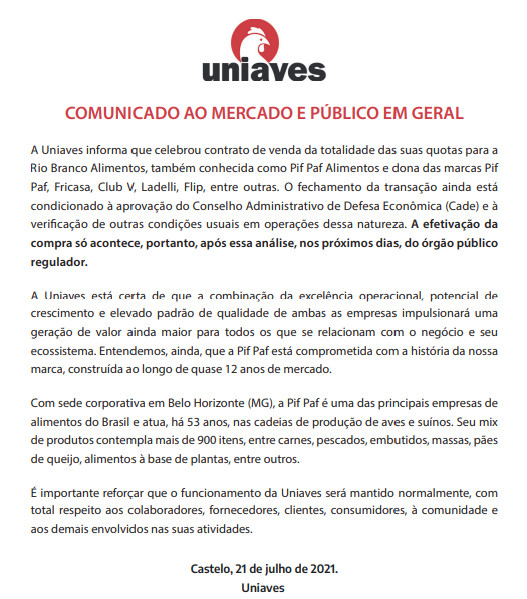 A capixaba Uniaves divulgou um comunicado, na tarde desta quinta-feira (22), reiterando a venda da empresa para a Pif Paf. A notícia foi dada em primeira mão pelo portal Conexão Safra, na última terça-feira (20).
