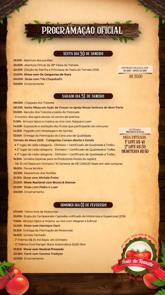 Ao longo dos três dias, o público poderá conferir uma agenda diversificada, que inclui almoço típico, concurso de qualidade do tomate, shows, sorteio de prêmios, além da tradicional tratorada, um dos símbolos da festa.