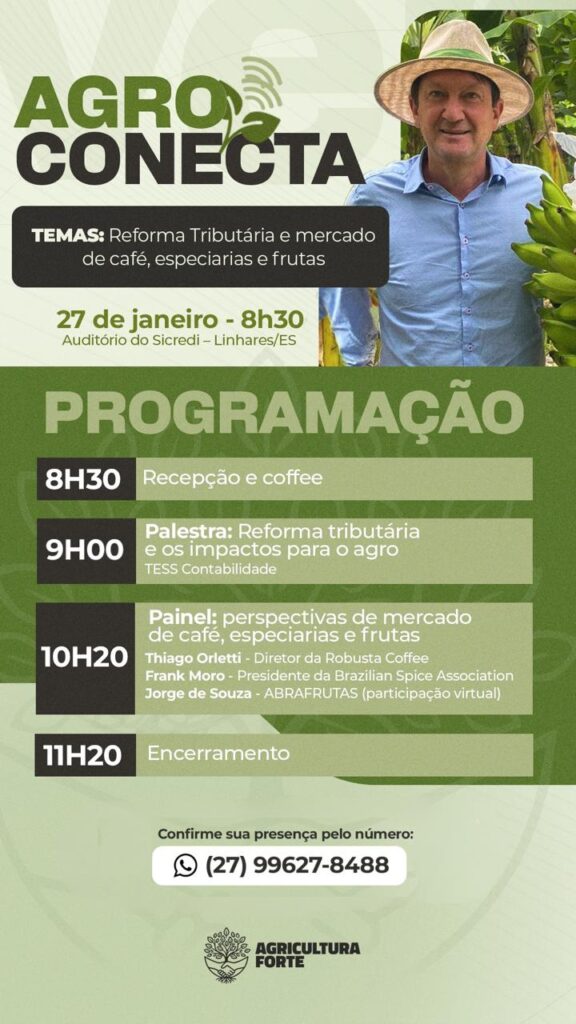 O tema que norteará o seminário é “Reforma Tributária e mercado de café, especiarias e frutas”. O foco é levar até os produtores temas atuais e decisivos para o setor. Na programação, palestra sobre “Reforma Tributária e os impactos para o agro”, ministrada pela Tess Contabilidade.