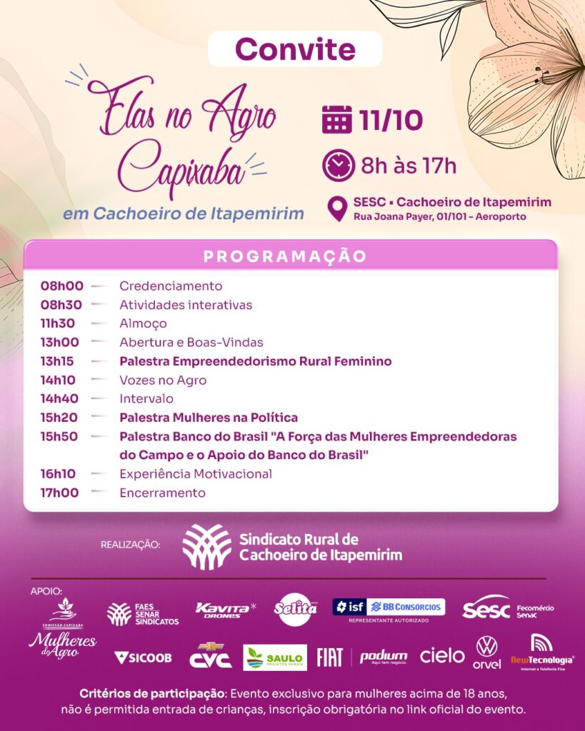 A programação vai reunir produtoras rurais, lideranças e profissionais ligadas ao campo em um dia de aprendizado, troca de experiências e fortalecimento do agro feminino na região sul do Espírito Santo.