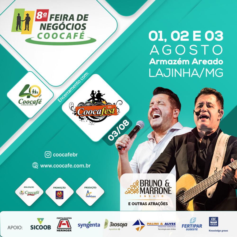Após meses de expectativa e muito trabalho chegou a hora de apresentar aos cooperados e toda a comunidade um dos eventos mais aguardados em toda a região das Matas de Minas e Montanhas do Espírito Santo: a 8ª Feira de Negócios Coocafé, que começa amanhã (01) e vai até o próximo sábado (03), no Armazém Areado, em Lajinha (MG). Com início às 8h, serãotrês dias de negócios e muito conhecimento.