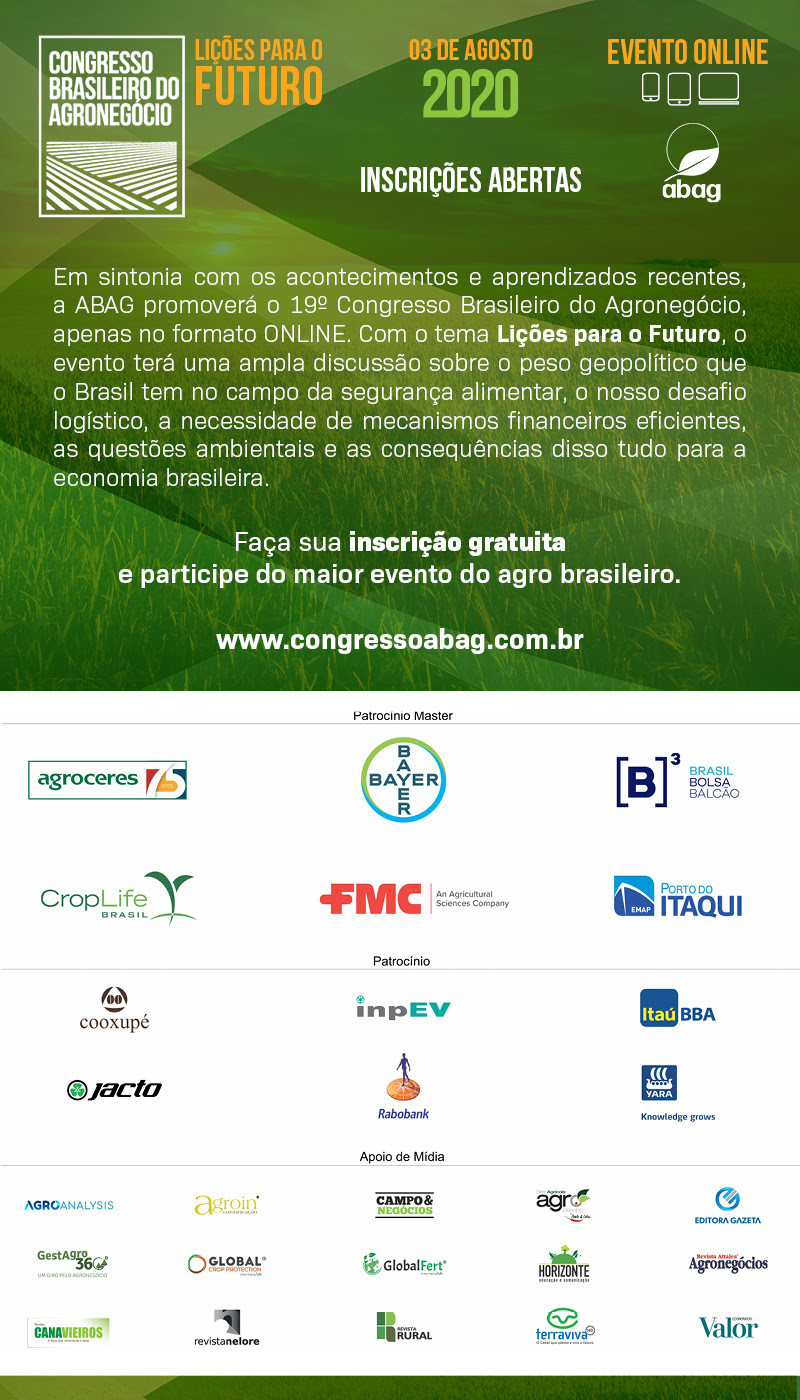 Em sintonia com os acontecimentos e aprendizados recentes, a ABAG promoverá o 19º Congresso Brasileiro do Agronegócio, apenas no formato ONLINE. Com o tema Lições para o Futuro, o evento terá uma ampla discussão sobre o peso geopolítico que o Brasil tem no campo da segurança alimentar, o nosso desafio logístico, a necessidade de mecanismos financeiros eficientes, as questões ambientais e as consequências disso tudo para a econimia brasileira.