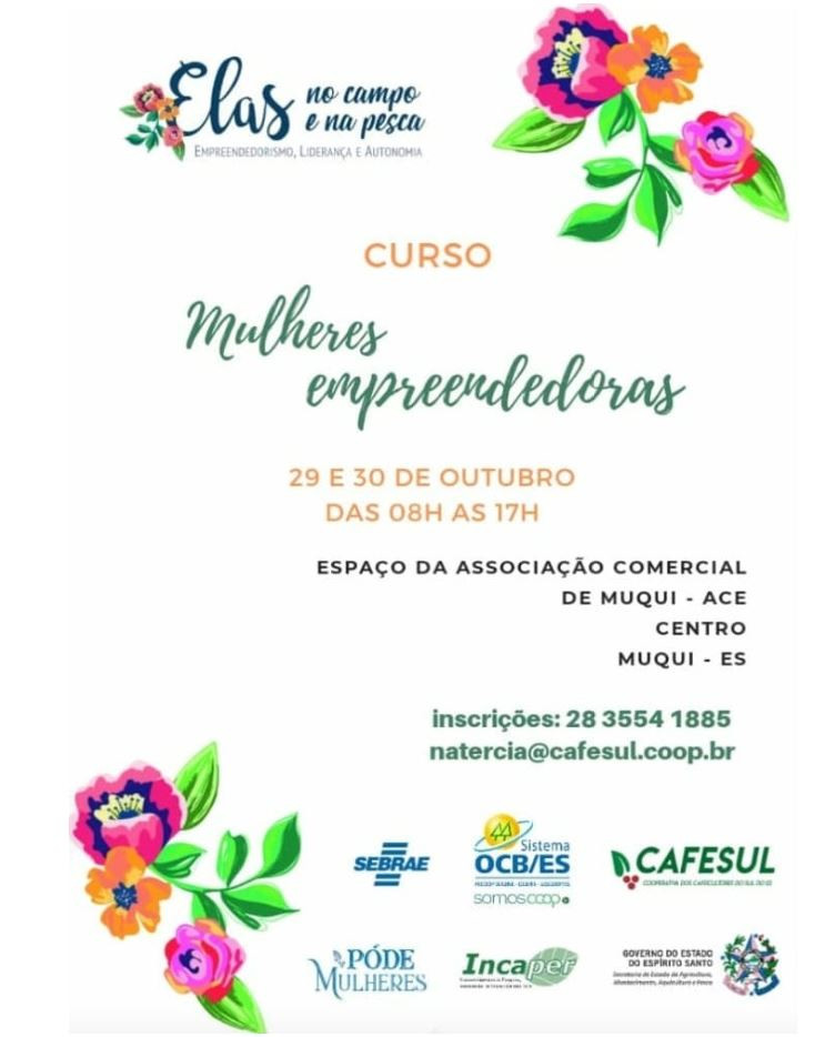 Como parte das ações que compõem a Agenda Mulher, nos dias 29 e 30 de outubro vai acontecer o curso “Mulheres Empreendedoras ”, no Espaço da Associação Comercial de Muqui, das 8h às 17h. O curso conta com o apoio do Sistema OCB/ES e do núcleo de mulheres da Cooperativa dos Cafeicultores do Sul do Estado do Espírito Santo (Cafesul), idealizadoras Póde Mulheres.