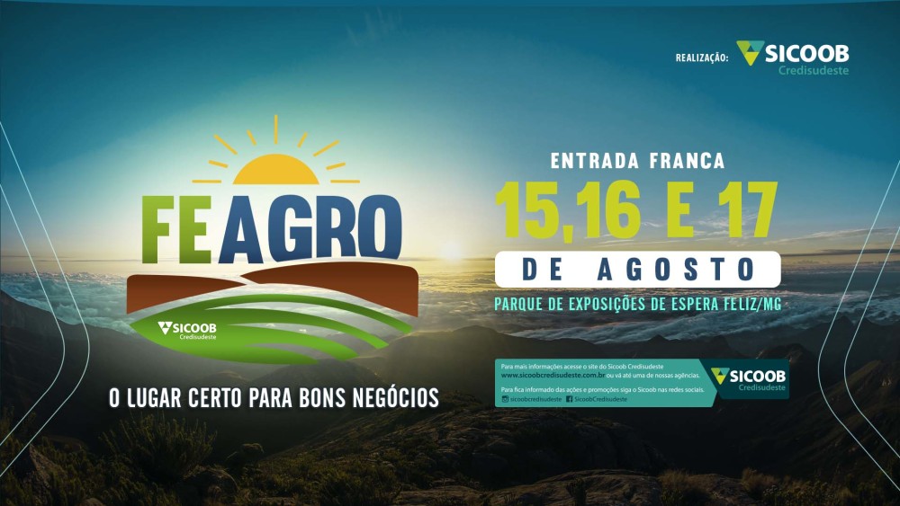 A Feira Agropecuária (Feagro) Espera Feliz 2019 será realizadade 15 a 17 de agosto, no Parque de Exposições da cidade, na Zona das Matas de Minas. O evento promovido pelo Sicoob Credisudeste será voltado aos associados de 19 municípios da região e visa difundir novas tecnologias e promover negócios. Mais de 4.000 pessoas são esperadas.