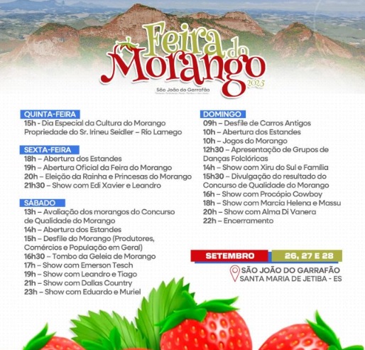 A programação da festa inclui eleição da rainha e da princesa do morango, concurso de qualidade da fruta, desfile temático, jogos rurais e o tradicional tombo da geleia de morango, além de atividades culturais e atrações musicais.