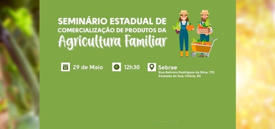 Atenção! Inscrições abertas para o Seminário Estadual de Comercialização de Produtos de Agricultura Familiar, que acontece no dia 29 de maio, 12h30, na sede do Sebrae ES, na Enseada Suá, emVitória. Para fazer a sua inscrição, é só acessar neste link
