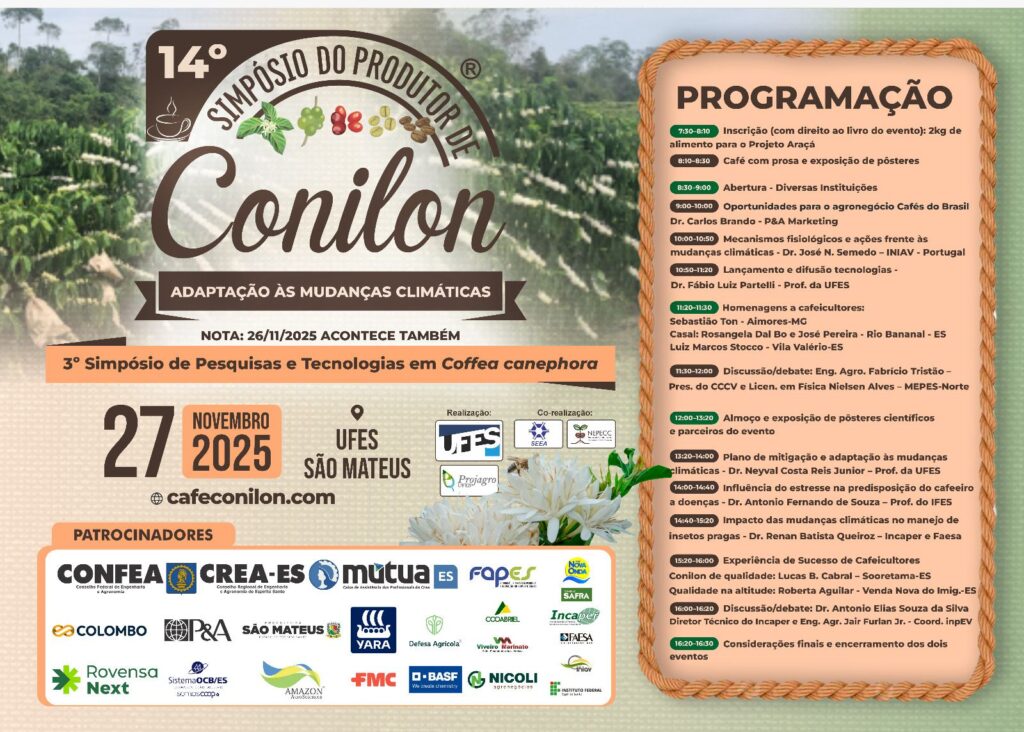 O 14º Simpósio do Produtor de Conilon será realizado no dia 27 de novembro, no Instituto Federal do Espírito Santo (Ifes) – Campus Alegre. O evento já se consolidou como um dos grandes encontros da cafeicultura capixaba, reunindo produtores, técnicos, pesquisadores e estudantes dos cursos ligados ao agronegócio.