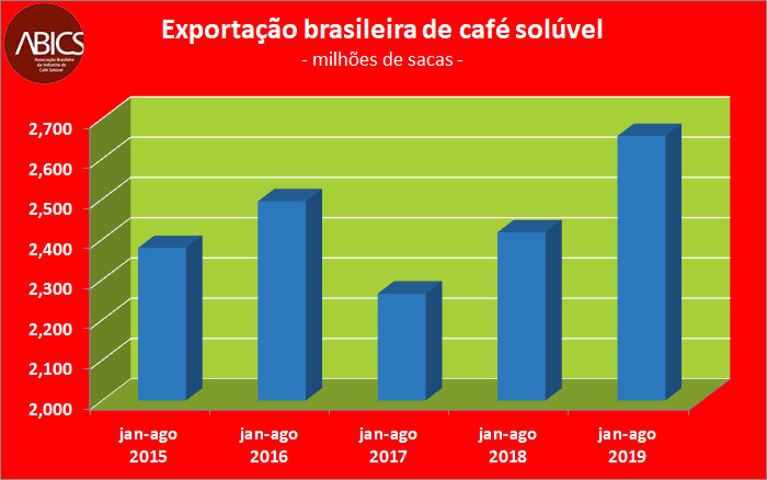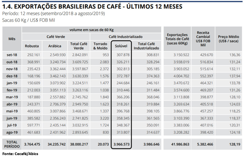 Após o recorde histórico registrado nas exportações de todos os tipos de café (verde e industrializado) pelo Brasil em 2018, o país segue demonstrando sua força no segmento. O café solúvel nacional atingiu seu melhor desempenho nos embarques acumulados no último período de 12 meses (set/18 a ago/19), tendo remetido o equivalente a 3,967 milhões de sacas de 60 kg ao exterior.