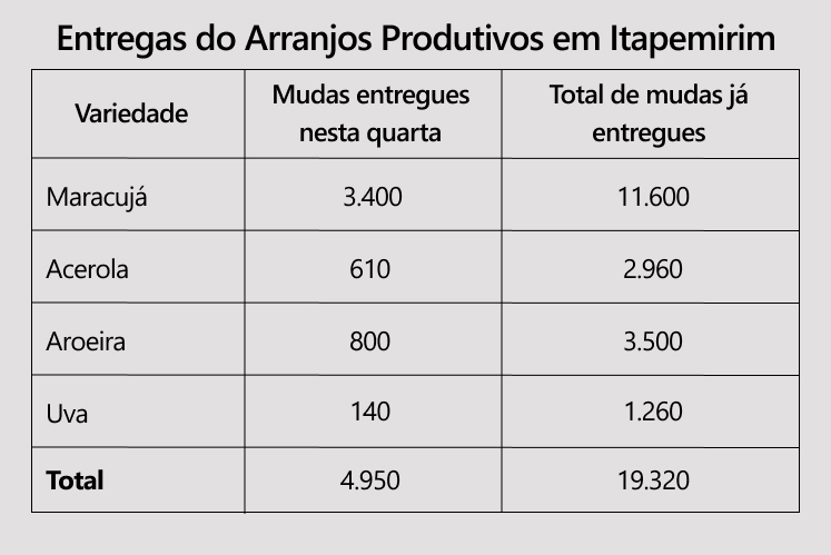 Em Itapemirim, os agricultores já haviam recebido 14.370 mudas das culturas acima e, com a nova remessa, o volume chega a 19.320 mudas – a maior parte de maracujá (11.600 mudas).