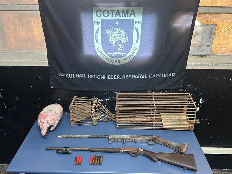 No início do mês, a equipe do Comando de Operações Táticas em Mata Atlântica do Batalhão de Polícia Militar Ambiental (Cotama – BPMA) apreendeu duas armas de fogo, seis munições calibre 22, quatro quilogramas de carne de animal silvestre abatido e armadilhas destinadas à captura de fauna, no município de Ibiraçu.