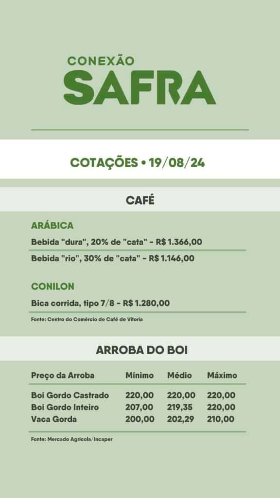 Confira as cotações do café, boi e hortifruti de hoje (19/08), com variações significativas que podem impactar produtores e consumidores.