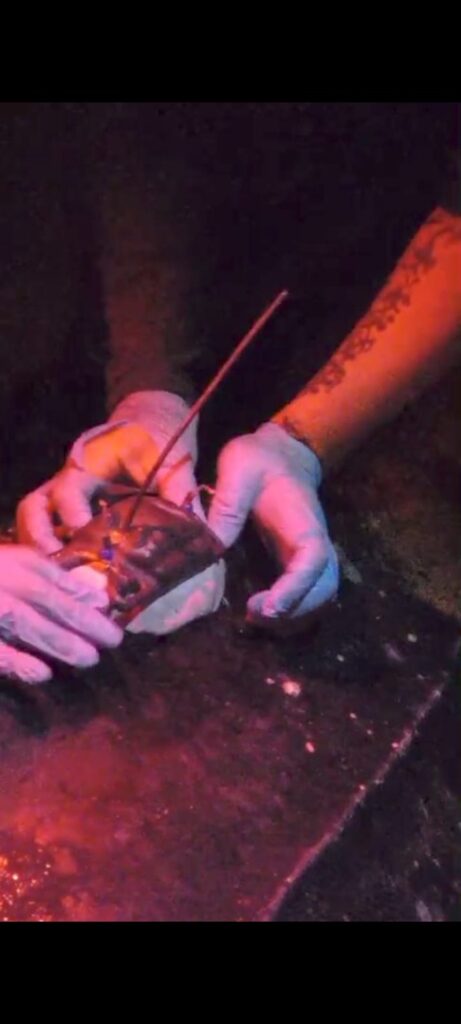 - Marcação dos animais avistados: é realizada a retirada de amostra de tecido e de sangue do animal, a sua medição e a colocação de anilha (anel de identificação);