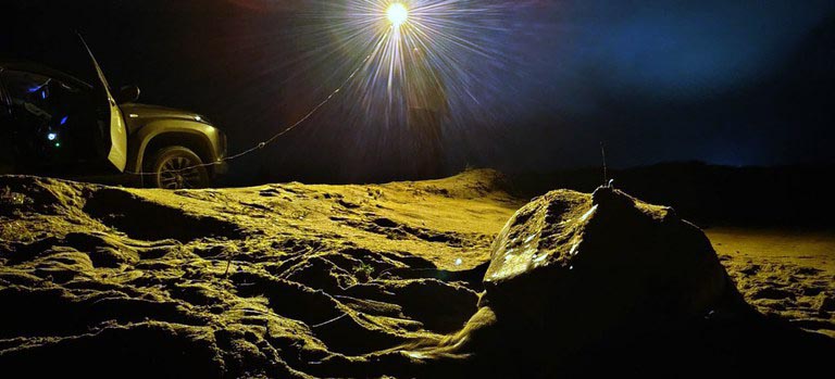 - Monitoramento das praias no período noturno: as equipes de monitoramento buscam fêmeas de D. coriacea ao longo da Rebio. Por muitas vezes, a localização dos animais é identificada pelo rastro deixado por elas na areia. As fêmeas sobem nas praias para a postura dos ovos geralmente entre 21h e 4h, preferencialmente quando a maré está cheia; há utilização de luz vermelha de baixa potência durante o manejo para evitar desconforto do animal ou alteração em seu comportamento (tartarugas são atraídas pela luz);