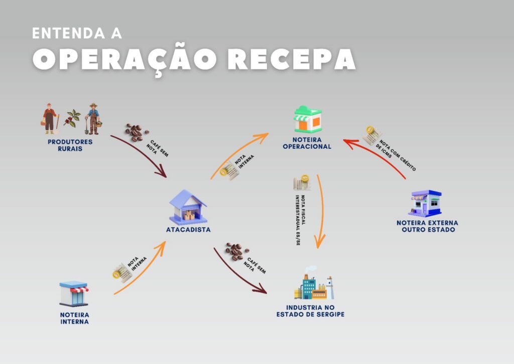 O esquema operava em duas etapas. Primeiro, atacadistas compravam café de produtores rurais pagando em dinheiro vivo, sem emissão de notas. Em seguida, recorriam às empresas noteiras para emitir notas de entrada fictícias e “regularizar” o estoque formado ilegalmente.