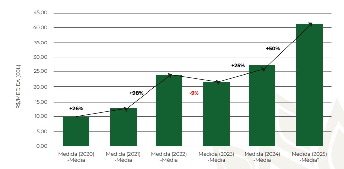 Para dar uma ideia, entre 2020 e 2025, o valor médio pago pela medida de 60L na colheita do café teve um crescimento acumulado de 322%, com destaque para os anos de 2022, 2024 e 2025. Esta elevação reflete a menor oferta de trabalhadores e o aumento da concorrência por mão de obra. Os dados são da Confederação da Agricultura e Pecuária do Brasil (CNA). Os custos produção também aumentaram. Segundo a Cedagro, os estudos feitos entre 2021 e 2023 já apontavam para um aumento nos custos, com a maior variação nos insumos, que subiram em média 26,58% no período.