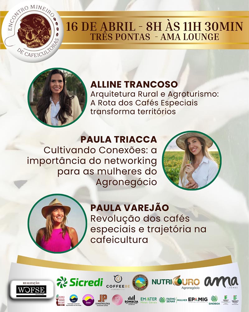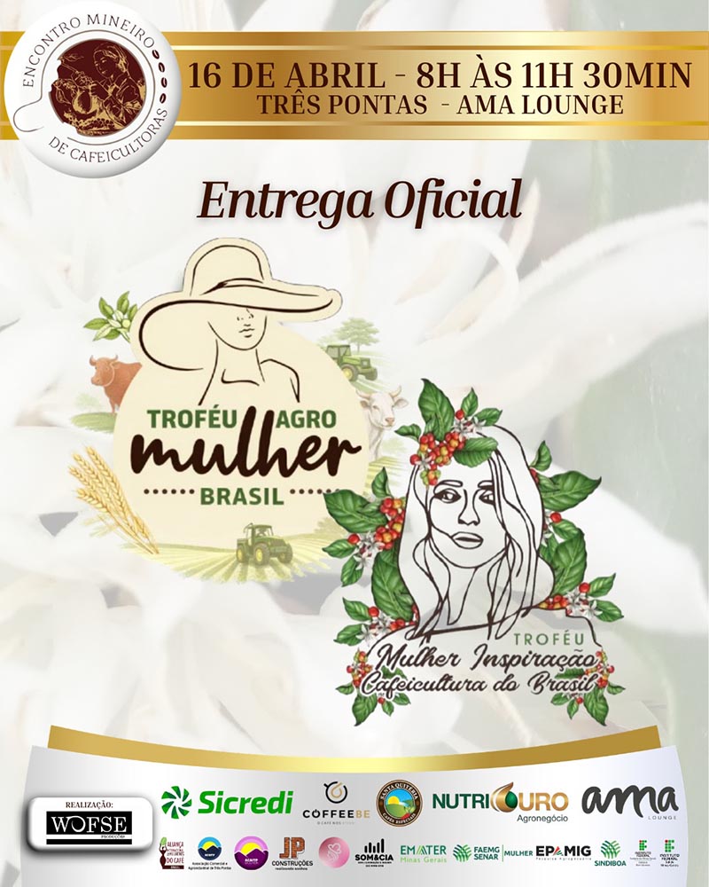 A força feminina que move o agronegócio brasileiro ganhou destaque nacional com o anúncio das 19 selecionadas da 6ª Edição dos Troféus Agro Mulher Brasil e Mulher Inspiração da Cafeicultura do Brasil, iniciativa coordenada pela WOFSE Produções. Mais do que uma premiação, é o reconhecimento de trajetórias que contribuem para a transformação destes setores e da sociedade. A entrega dos Troféus ocorrerá no dia 16 de abril, em Três Pontas, no Sul de Minas Gerais, durante o 9º Encontro Mineiro de Cafeicultoras. A cerimônia será realizada no Ama Lounge, localizado na Travessa Azarias Ferreira de Mesquita, nº 31.