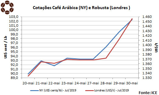 Na Bolsa de Nova York, o vencimento julho/19 do contrato “C” subiu 905 pontos até ontem, encerrando o pregão a US$ 1,0235 por libra-peso. Na ICE Futures Europe, o vencimento julho/19 do café robusta fechou a sessão de quinta-feira a US$ 1.456 por tonelada, acumulando ganhos de US$ 88.